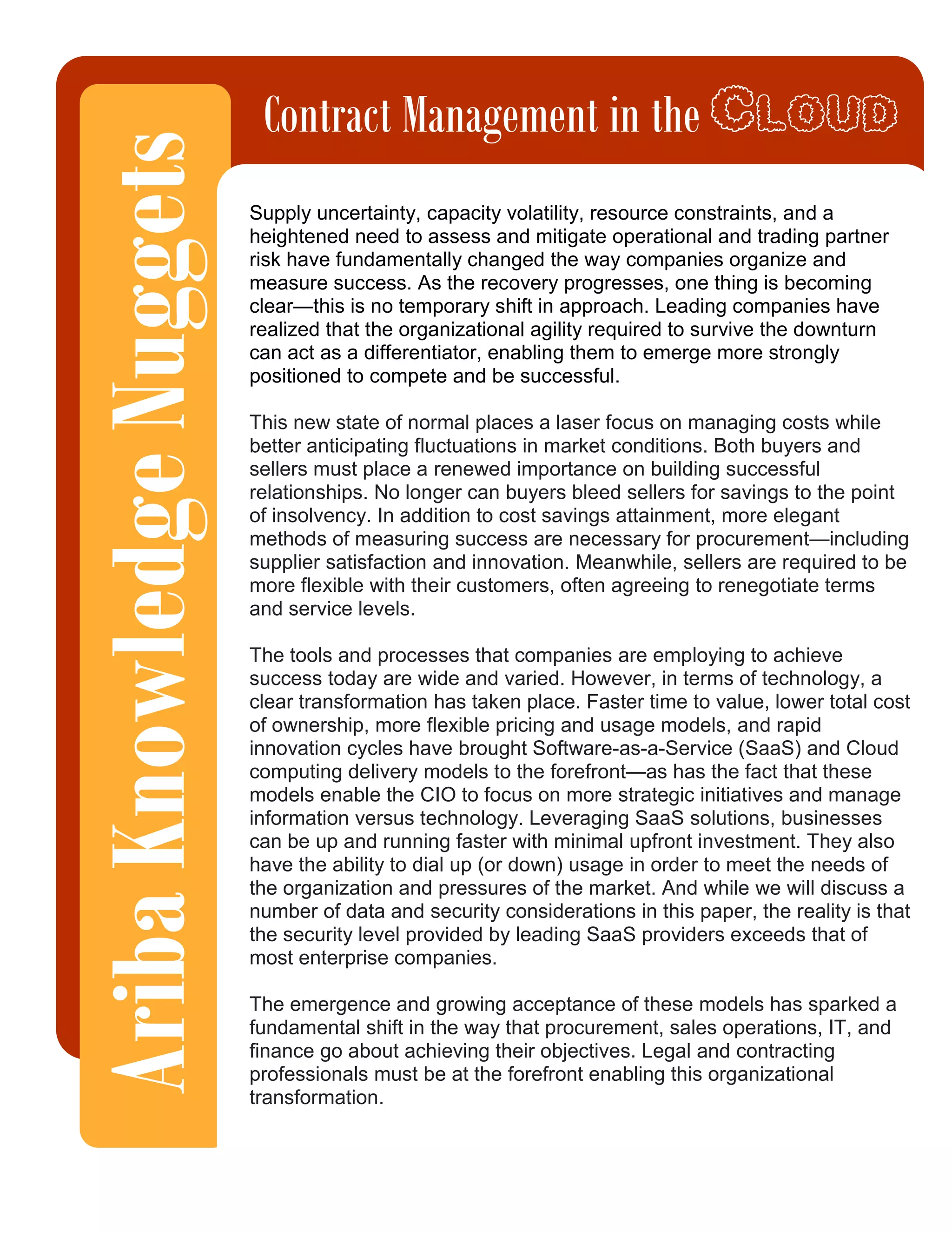 An increasing number of companies are embracing cloud-based solutions like SaaS to manage critical tasks across various business functions including contract management. However, contract negotiators are often not included early in the process of evaluating new solutions. Effective contract management in the cloud requires alignment between business users and legal teams from the start to ensure contract terms meet both business and legal needs.