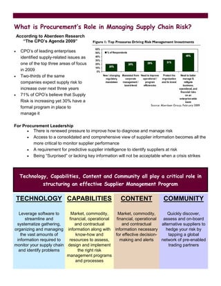 This document discusses building a successful supplier management program. It outlines some of the challenges companies face today such as economic volatility and increased business risk. It then discusses how proactively managing risk, implementing efficient processes, and becoming more agile can help companies address these challenges. The document also summarizes research finding that supply chain risk is increasing and more formal risk management programs are needed. It argues that technology, capabilities, content and community all play important roles in structuring effective supplier management programs.