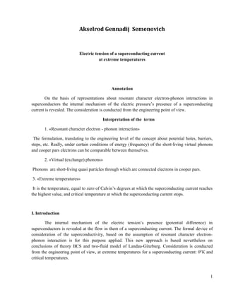 The document discusses the internal mechanism of electric potential in superconductors carrying a superconducting current. It reveals that the potential difference is due to the difference in electron attraction energies between the normal and superconducting states of the material. This difference is caused by resonant electron-phonon interactions. The potential is analyzed at extreme temperatures of 0K and the critical temperature, using concepts from quantum mechanics, relativity, and BCS theory. The potential difference provides an explanation for electric fields in superconductors without resistance.