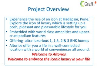Akshar Altorios is a residential project located in Hadapsar, Pune that offers luxurious apartments. It has world-class amenities like a swimming pool, library, banquet hall, and gym. The apartments range from 1 to 3 BHK and are located near various amenities like hospitals, schools, and parks. The project emphasizes luxury features like modular kitchens, branded fittings, and security systems.