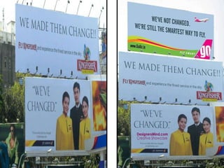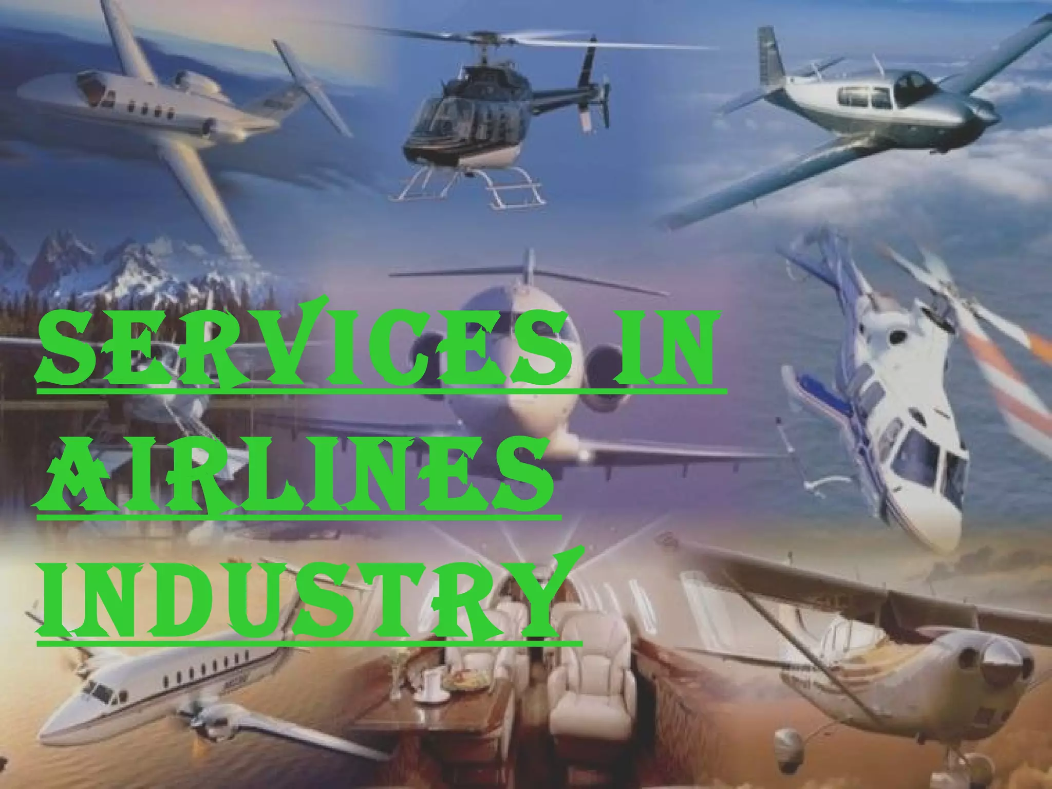 The document discusses services in the airline industry. It provides details about major Indian airlines such as Jet Airways and Kingfisher Airlines. It summarizes that air travel remains a large and growing industry that facilitates economic growth. It also discusses various aspects of service marketing used in the airline industry such as product mix, price mix, promotion mix, and physical evidence.