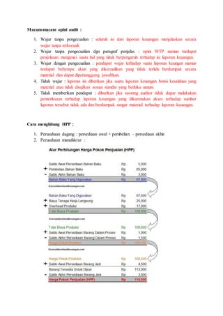 Ada beberapa jenis opini audit yang dapat diberikan auditor, yaitu opini wajar tanpa pengecualian, wajar tanpa pengecualian dengan paragraf penjelas, wajar dengan pengecualian, tidak wajar, dan tidak memberikan pendapat. Biaya berbeda dengan beban, di mana biaya ditujukan untuk mendapatkan manfaat di masa depan sedangkan beban terkait dengan penggunaan sumber daya.