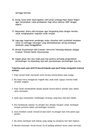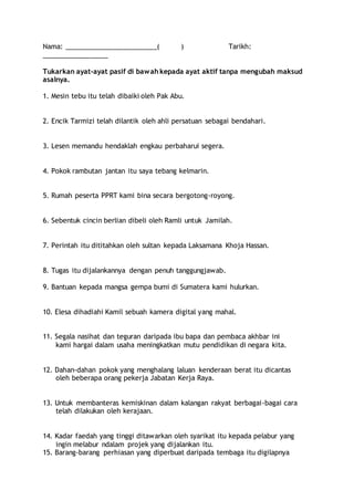 Dokumen ini mengandungi latihan untuk menukarkan ayat pasif kepada ayat aktif dan sebaliknya tanpa mengubah maksud asal ayat. Terdapat dua bahagian latihan, satu untuk ayat pasif dan satu untuk ayat aktif, dengan jumlah 40 ayat yang perlu ditukar. Tujuan latihan adalah untuk mempertingkatkan kemahiran pemahaman dan penggunaan struktur ayat dalam Bahasa Melayu.
