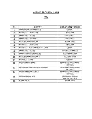 The document outlines the activities and proposed dates for three programs - Program Linus, Program Nilam, and Perpustakaan (Library) activities for 2014. For Program Linus, activities include orientation, screening tests, meetings, literacy and numeracy programs from January to October. Program Nilam activities focus on reading promotion from February to October through various programs. Library activities consist of meetings, book fairs, and orientation from January to September.