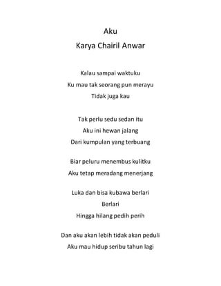 Puisi ini menceritakan tentang seseorang yang tidak ingin dirinya dirayu oleh siapapun saat ajal menjemputnya. Ia menganggap dirinya sebagai hewan liar yang terbuang dari kelompoknya. Meskipun terluka dan berdarah, ia akan terus berlari hingga rasa sakit hilang dan tidak peduli lagi. Ia ingin hidup seribu tahun lagi.