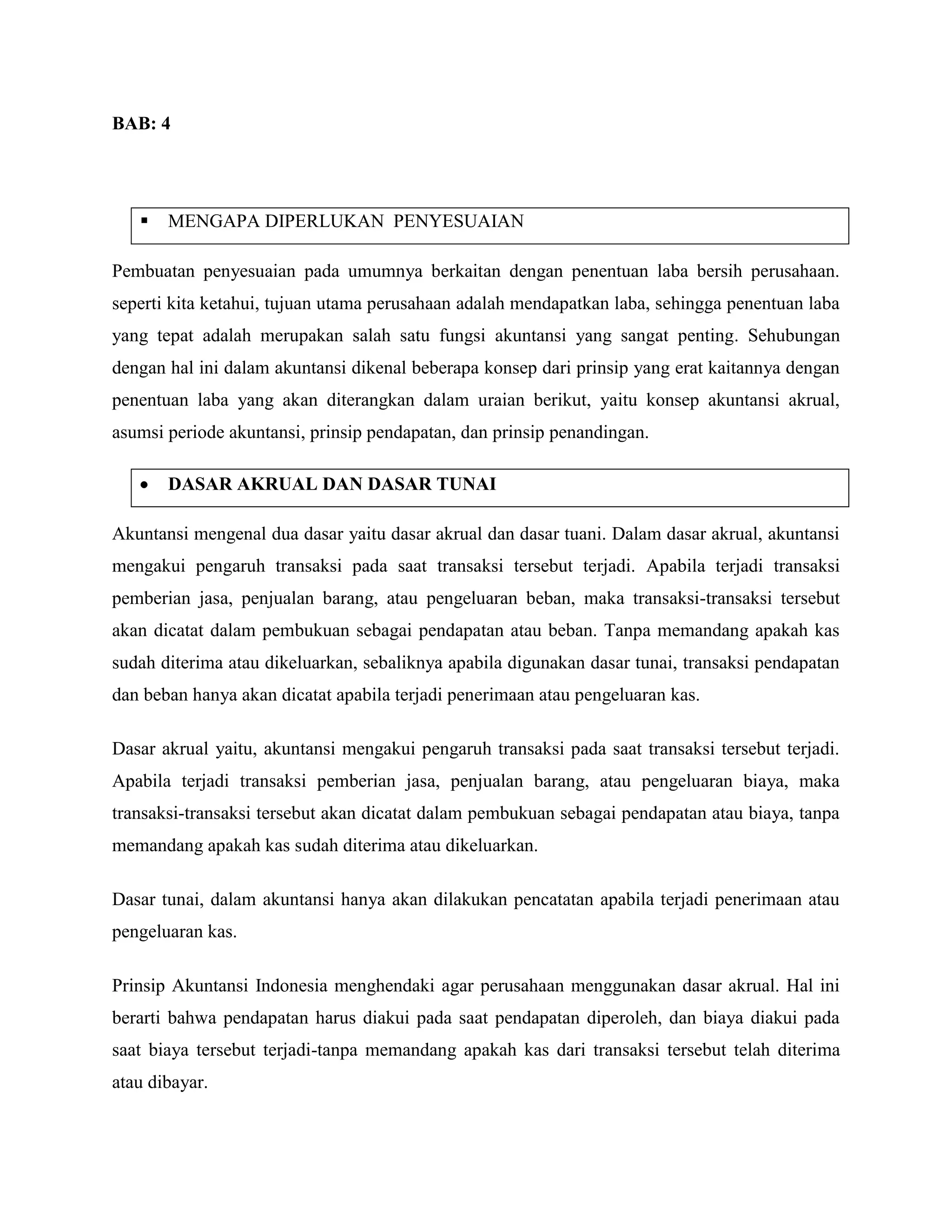 Bab 4 membahas mengapa diperlukan penyesuaian dalam akuntansi, terutama untuk menentukan laba bersih perusahaan. Prinsip-prinsip akuntansi seperti dasar akrual, periode akuntansi, prinsip pendapatan dan penandingan, serta tujuan penyesuaian yaitu agar setiap akun menunjukkan jumlah yang sebenarnya pada akhir periode. Terdapat dua kategori penyesuaian yakni deferral dan akrual.
