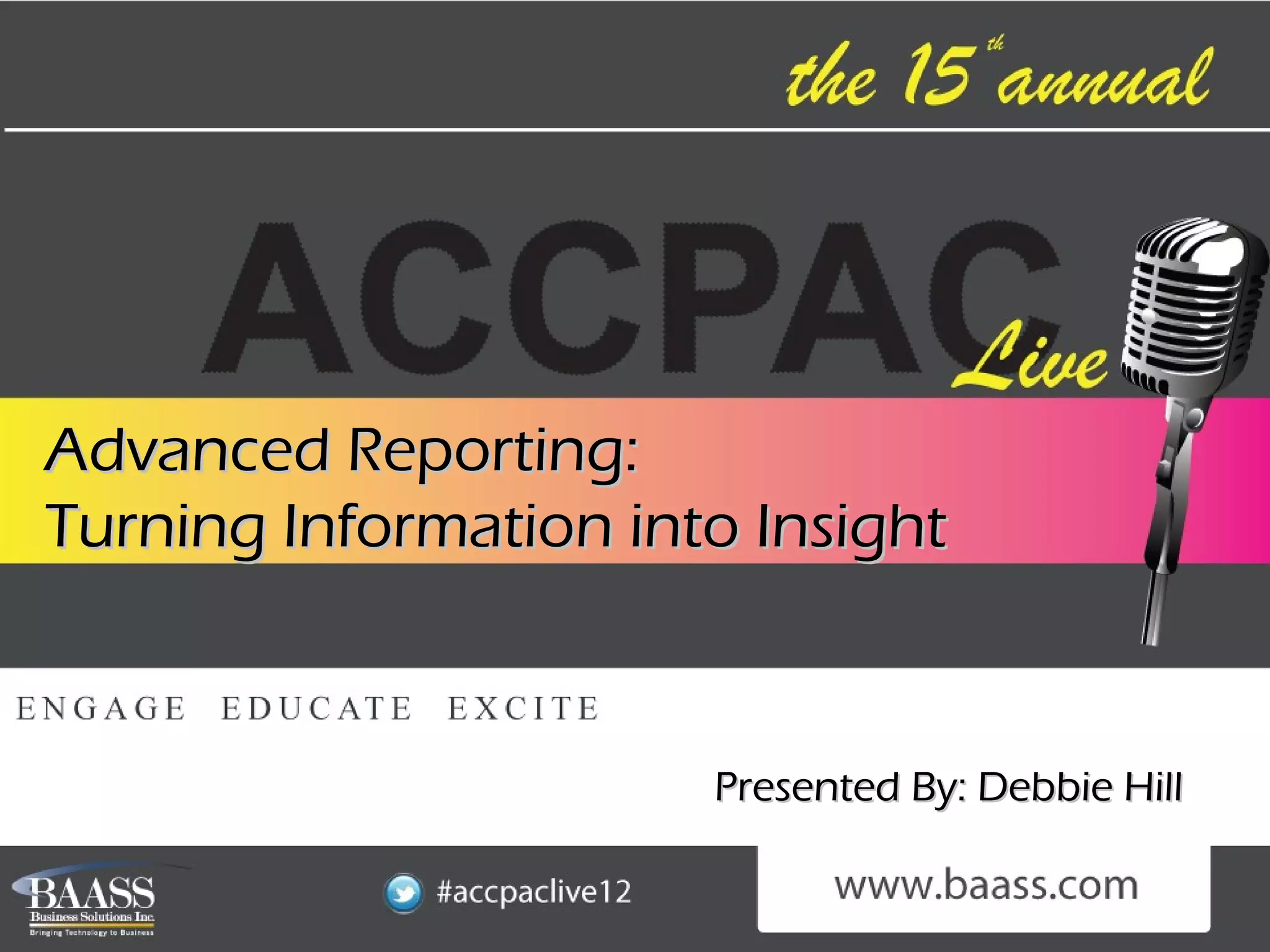 The document outlines a presentation by Debbie Hill on advanced reporting with a focus on leveraging Sage Intelligence for effective data analysis. It covers audience engagement, explores the differences between various reporting options, and details how Sage Intelligence facilitates insightful reporting. The presentation includes steps for installation and resources for further learning.