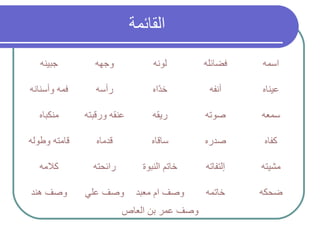 يتناول المستند صفات الرسول محمد صلى الله عليه وسلم من حيث الشكل والخصائص الشخصية والفضائل، مستعرضًا العديد من الأحاديث النبوية التي تصف مظهره وسماته. يشمل ذلك تفاصيل عن لون بشرته، وحسن وجهه، وسمو صفاته، ودعوته للناس. كما يبرز فضل النبي كخاتم الأنبياء ومكانته العالية عند الله.