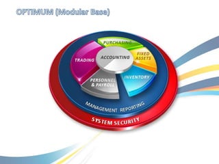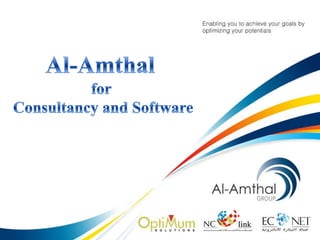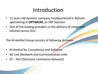 The document summarizes Al-Amthal Group, a leading ERP solutions provider in Bahrain and GCC. It discusses the company's mission to optimize customer potential through business process reengineering and cost-effective IT solutions. It then describes OPTIMUM, their flagship ERP product, which offers general ledger, accounting, inventory, HR and other modules. The document lists some government, semi-government, education, banking and other clients that use OPTIMUM and outlines their implementation process.