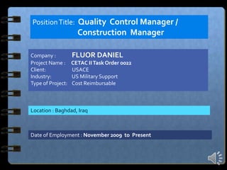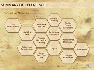This document contains a biography and resume for Alvo C. Dabney Jr. It summarizes his education, which includes graduating from Camden High School in 1973 and obtaining degrees from the University of South Carolina in 1975 and Midlands Technical College in 1977. It also outlines his extensive experience over 40 years in project management and construction roles for companies like Fluor, Southeland Associates, and Thompson Industrial Services on industrial and military projects domestically and internationally.
