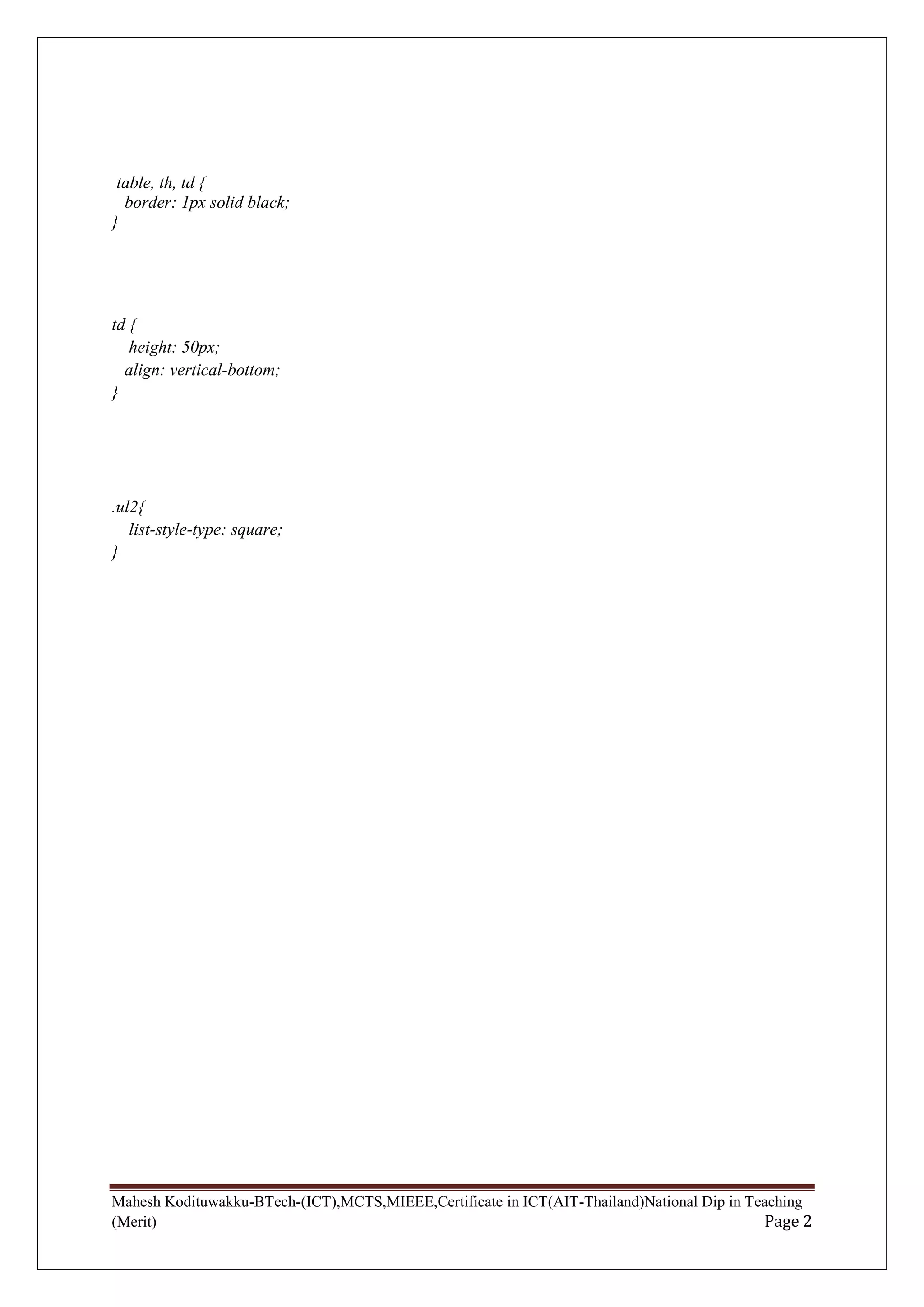 ICT(AIT-Thailand)National Dip in Teaching (Merit) Page 2 table, th, td { border: 1px solid black; } td { height: 50px; align: vertical-bottom; } .ul2{ list-style-type: square; }