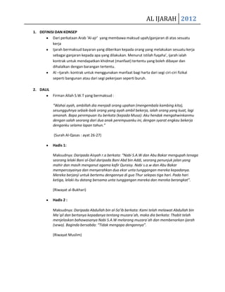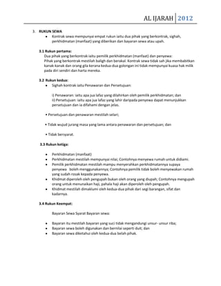 Dokumen ini membincangkan konsep dan definisi al-ijarah, yang merupakan kontrak sewa untuk mendapatkan khidmat atau manfaat tertentu. Terdapat juga penjelasan mengenai rukun-rukun kontrak sewa, jenis-jenis sewa, serta penamatan kontrak. Selain itu, dokumen ini turut menerangkan mengenai al-ijarah thumma al-bai’i sebagai kaedah sewa beli dalam prinsip muamalat Islam.