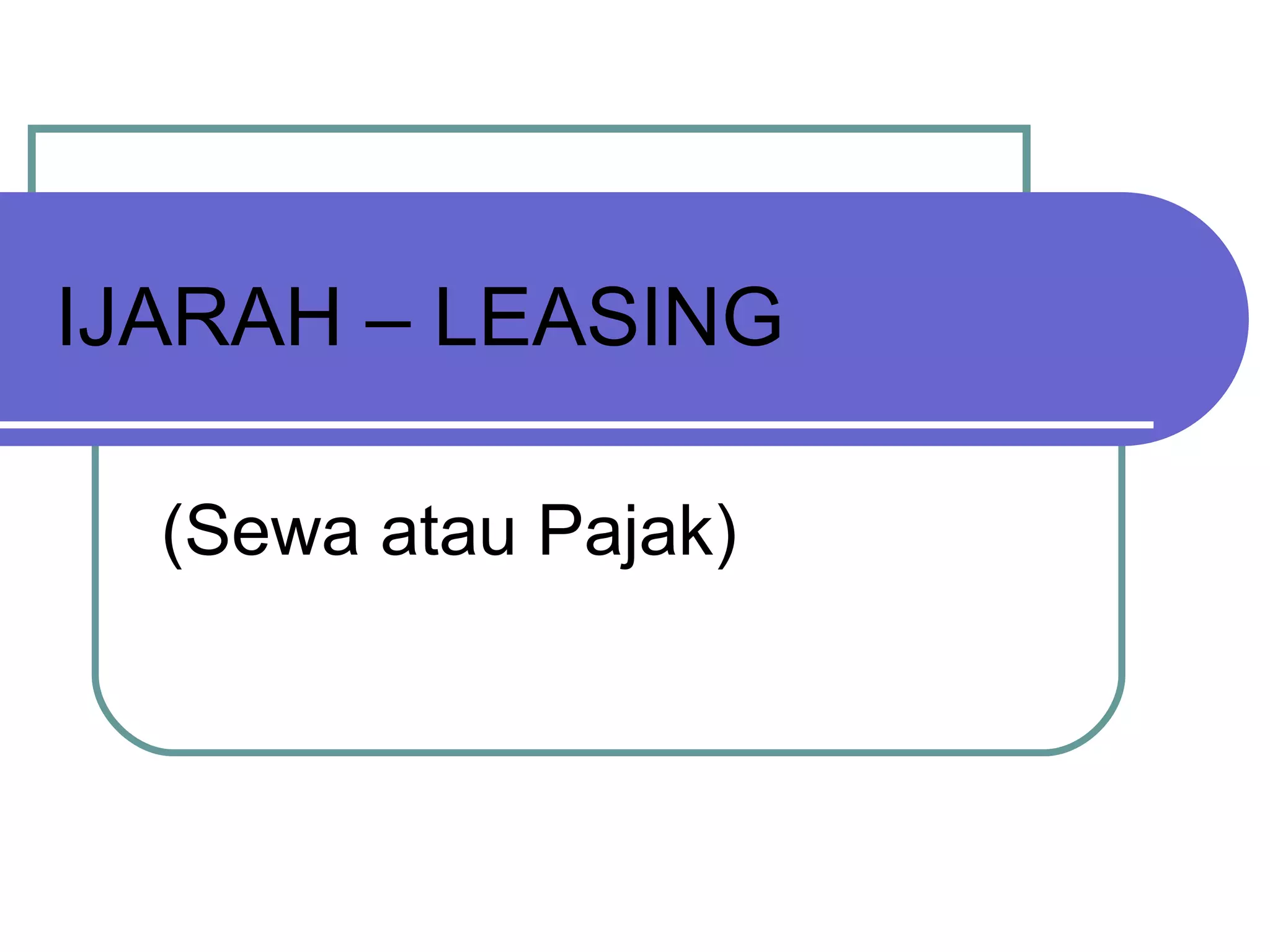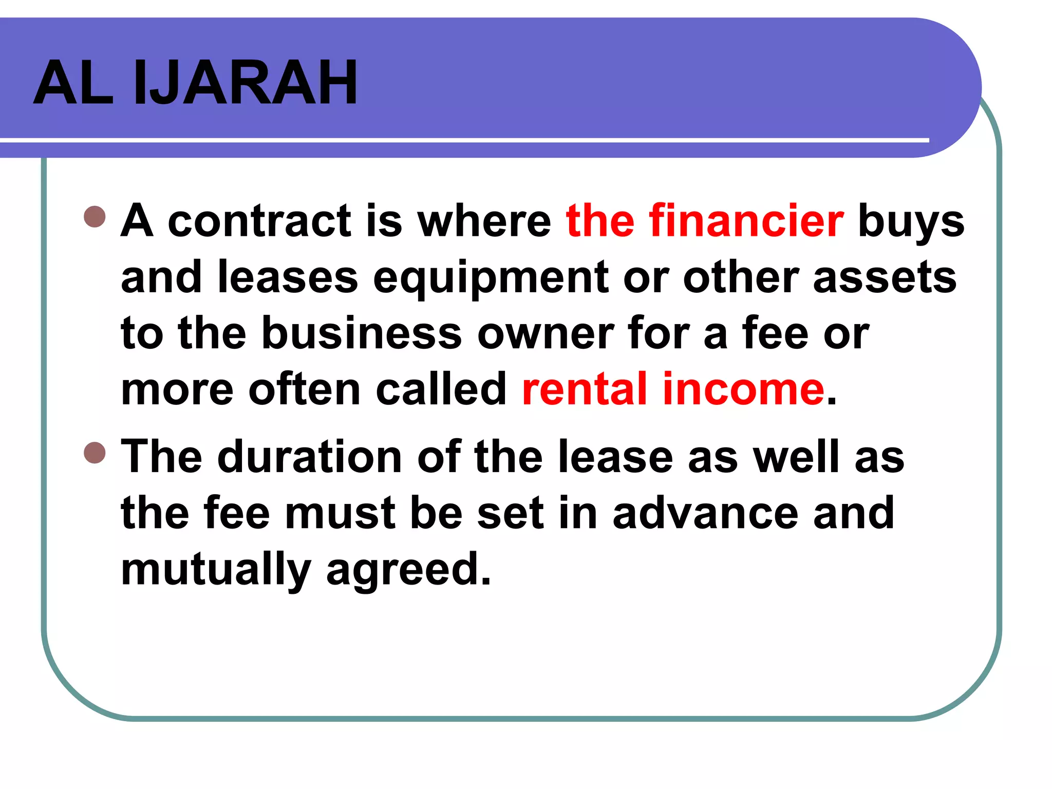 Ijara or leasing is an Islamic financing contract where the financier buys an asset and leases it to a business owner for a rental fee. There are several types of ijara contracts: basic ijara for leasing services or assets; ijara muntahia bittamleek which allows the lessee to purchase the asset; and al-ijarah wa al-iqtina which is a lease-to-own agreement commonly used for home financing. The ijara contract must meet conditions such as clearly specifying the purpose and responsibilities of both parties, and cannot involve uncertainty around prices, interest, or penalties.