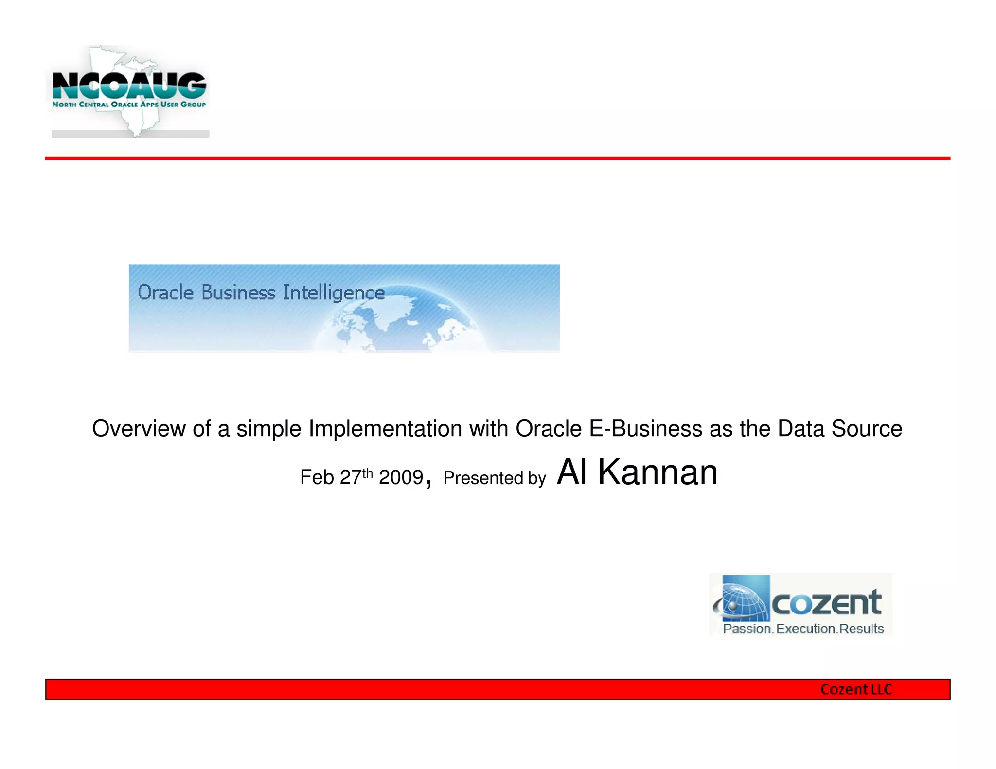The document provides an overview of implementing Oracle Business Intelligence Enterprise Edition (OBIEE) using an Oracle E-Business data source. It outlines the objectives to introduce OBIEE, demonstrate installation basics, repository creation, and sample reports. It describes OBIEE architecture with clients, presentation services, server, and data sources. It also covers installation options, the report development process, creating simple and star schema reports, and next steps.