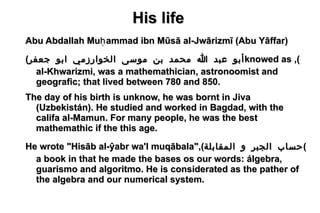 Al-Khwarizmi was an influential Persian mathematician, astronomer and geographer who lived between 780-850 CE. He worked in Baghdad during the time of the Abbasid Caliph al-Mamun and made significant advances in algebra and helped establish the decimal numeral system. In his influential book "Hisāb al-jabr wa-l-muqābala", he introduced the concepts of algebra, algorithms and much of the terminology still used today. He is considered the father of algebra and a pioneer in early Islamic mathematics.
