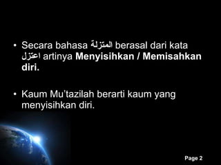 Kaum Mu'tazilah adalah kelompok yang memisahkan diri dari Ahlus Sunnah pada abad ke-2 Hijriyah di Bashrah, Irak. Mereka menolak konsep taqdir Allah dan mengklaim bahwa akal adalah hukum tertinggi. Beberapa khalifah Islam seperti Ma'mun mendukung pandangan Mu'tazilah namun ajaran ini kemudian ditolak oleh ulama.
