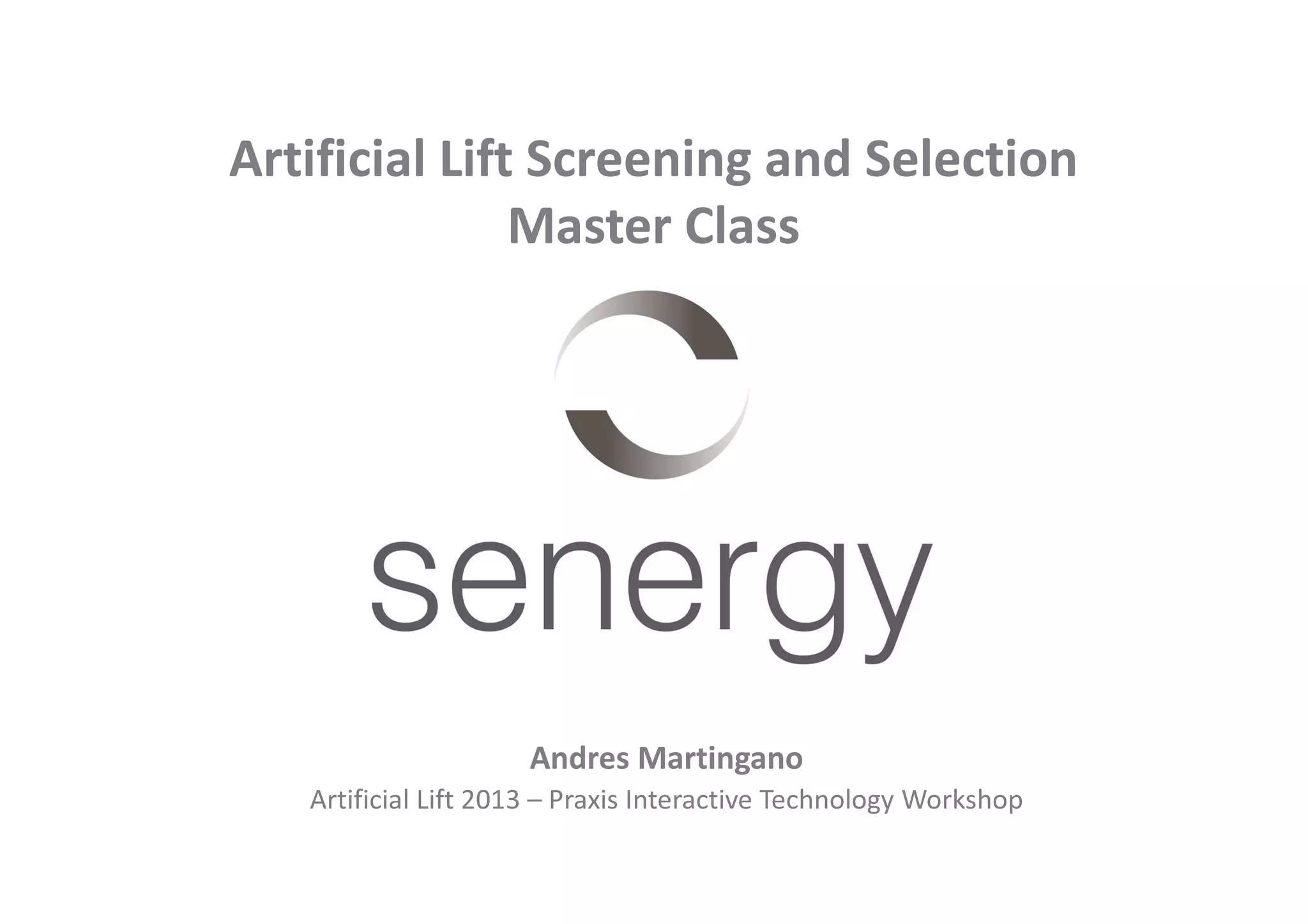 The document outlines a masterclass on artificial lift screening and selection, emphasizing the process's importance in optimizing liquid production from wells. It presents a systematic three-step process for selecting artificial lift methods, covering screening, evaluation, and selection, and highlights various technologies and their characteristics. Additionally, it underscores the impact of effective artificial lift selection on reservoir management, production efficiency, and overall asset value.