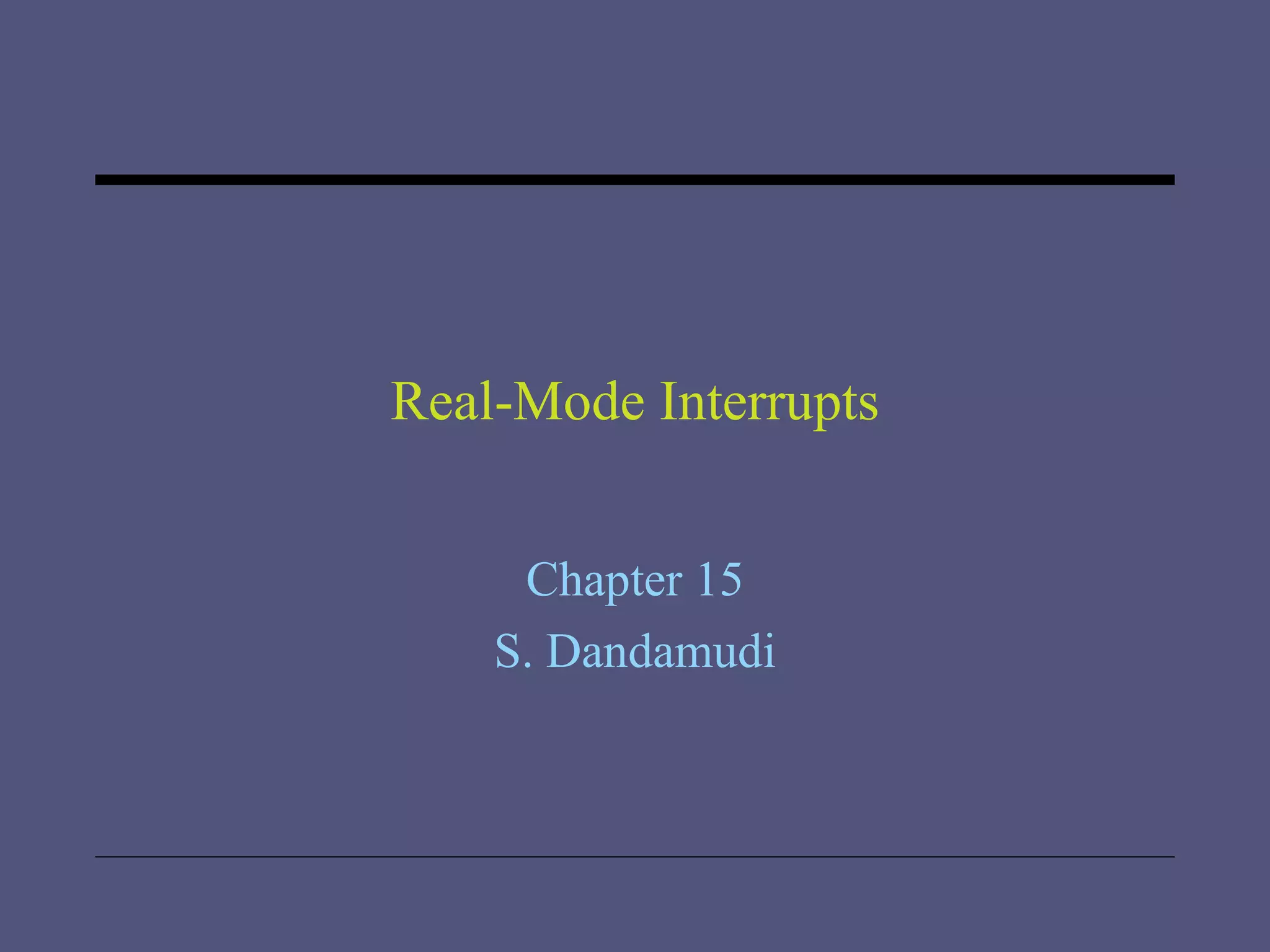 The document discusses interrupt processing in real mode, including how interrupts are handled using an interrupt vector table located at base address zero. It describes the typical structure of an interrupt service routine (ISR) and how they are invoked and returned from. It also covers software interrupts, keyboard services, BIOS services, text output, I/O device control, and interrupt controllers.