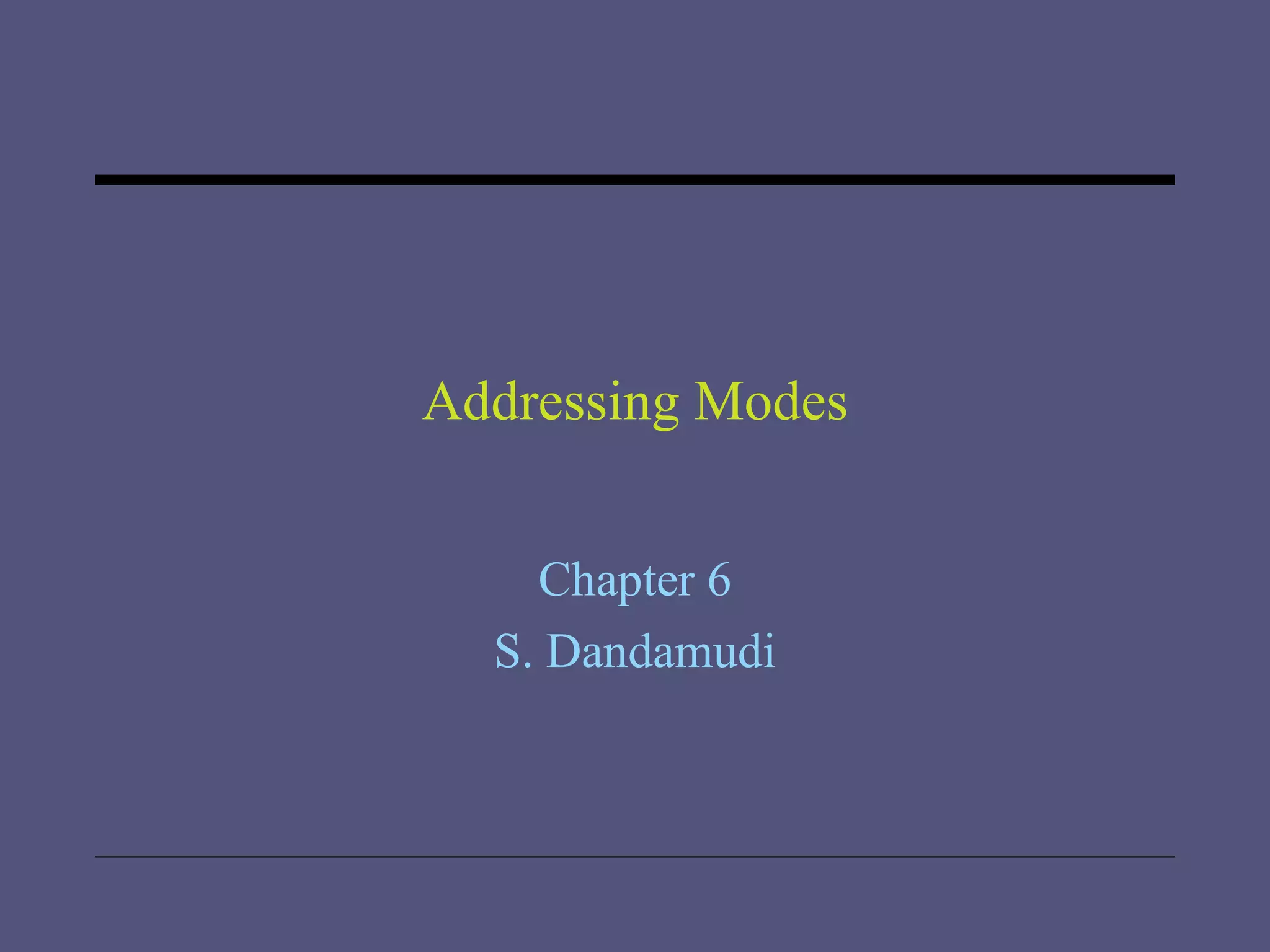The document discusses various addressing modes supported by Pentium processors including register, immediate, and memory addressing modes. It describes simple addressing modes like register and immediate, as well as different memory addressing modes like direct, indirect, based, indexed, and based-indexed addressing. Examples of using arrays and different addressing modes for operations like insertion sort and finding sums are also provided. Performance tests show benefits of supporting flexible addressing modes over just indirect addressing and benefits of using scale factors.