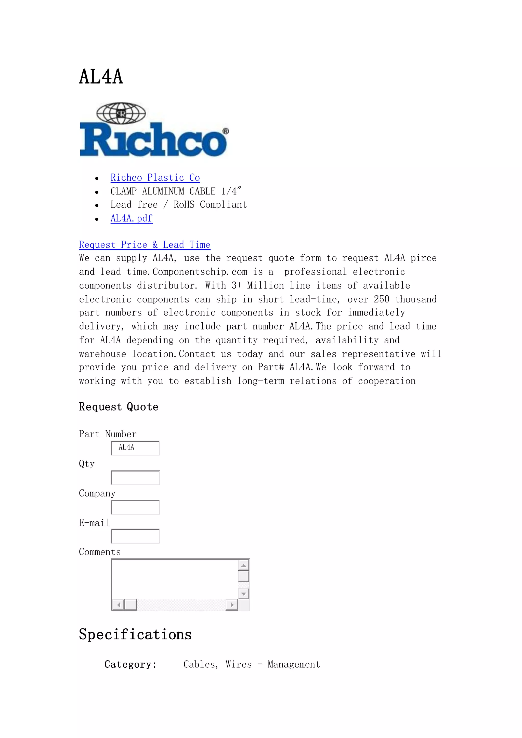 The document provides information about the aluminum cable clamp part number al4a from Richco Plastic Co., detailing its specifications, compliance, and ordering process. It highlights that ComponentsChip.com is a distributor with a wide inventory of electronic components available for immediate delivery. Customers can request quotes for prices and lead times through a form on the website.