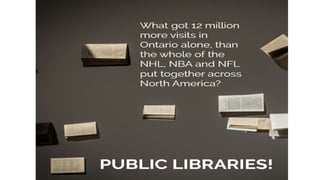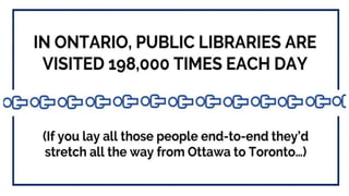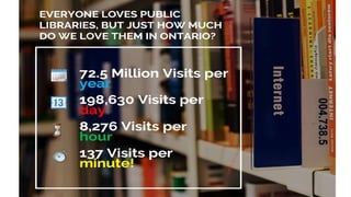 Ontarians visit their public libraries more than any other cultural, recreational, or commercial activity. Public libraries in Ontario average 198,630 visits per day - more daily visits than all major sports teams combined and more than foreign tourists visiting all of Canada. With over 1,157 branches serving 99.34% of Ontario's population, public libraries are truly the most widely used and accessible community hubs across the province.