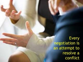 The document discusses negotiation strategies, emphasizing the importance of understanding both parties' needs and identifying hidden interests to resolve conflicts effectively. It highlights the advantages and disadvantages of different bargaining approaches and the significance of building relationships and maintaining open communication. Additionally, it underlines the impact of personal and contextual factors on negotiation dynamics, and suggests various techniques for achieving mutual benefits.