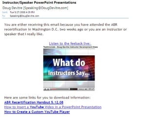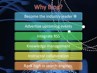 The document provides extensive information on creating and enhancing PowerPoint presentations, utilizing tools such as Smart Art, video insertion, and hyperlinks. It also covers social media strategies for marketing, blogging, and building online profiles across various platforms like LinkedIn, Facebook, and Twitter. Additionally, it outlines resources for online collaboration, email marketing challenges, and tools for video and screen recording.