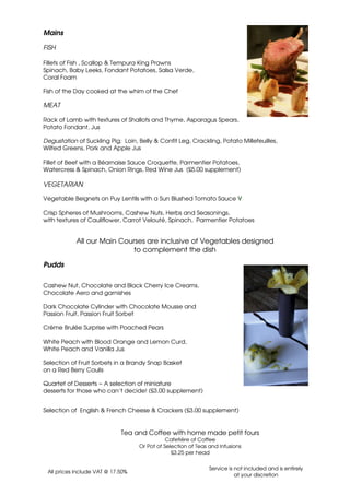 Cassons Restaurant is located at Arundel Road in Chichester, 2.5 miles east of the city center with ample parking. Their a la carte menu offers 2 courses for £27 and 3 courses for £35, with supplements noted for some dishes. They accommodate all dietary needs and are celiac friendly, making their own gluten-free bread. Starters include crab cylinders with asparagus mousse and smoked duck breast with foie gras. Mains include fish, lamb, suckling pig, and vegetarian options. Desserts feature ice creams, chocolate, creme brulee, and seasonal fruit sorbets. Tea, coffee and petit fours are offered after for