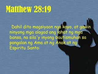 Ang dokumento ay naglalaman ng mga talata mula sa Bibliya na nag-uudyok sa mga tao na maging mga alagad at isakatuparan ang nakasaad na mga utos. Tinuturo rin nito ang kahalagahan ng pananampalataya at pagsunod kay Cristo, kasama ang mga kondisyon para sa tunay na pagtalima. Binibigyang-diin ang mga aral ng pag-ibig, sakripisyo, at dedikasyon sa Diyos sa pamamagitan ng mga salita ng iba't ibang apostol.