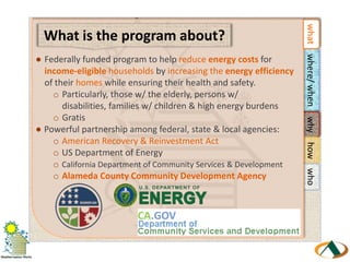 The Weatherization Assistance Program in Alameda County aims to reduce energy costs for income-eligible households by improving home energy efficiency while ensuring health and safety, particularly for vulnerable groups. The program, funded by federal and state agencies, is available across most of Alameda County until March 2012 or until funds are exhausted, offering benefits such as reduced energy bills and improved indoor air quality. Eligibility requires households to have a total gross income at or below 75% of California's state median income, along with submission of necessary documentation for participation.