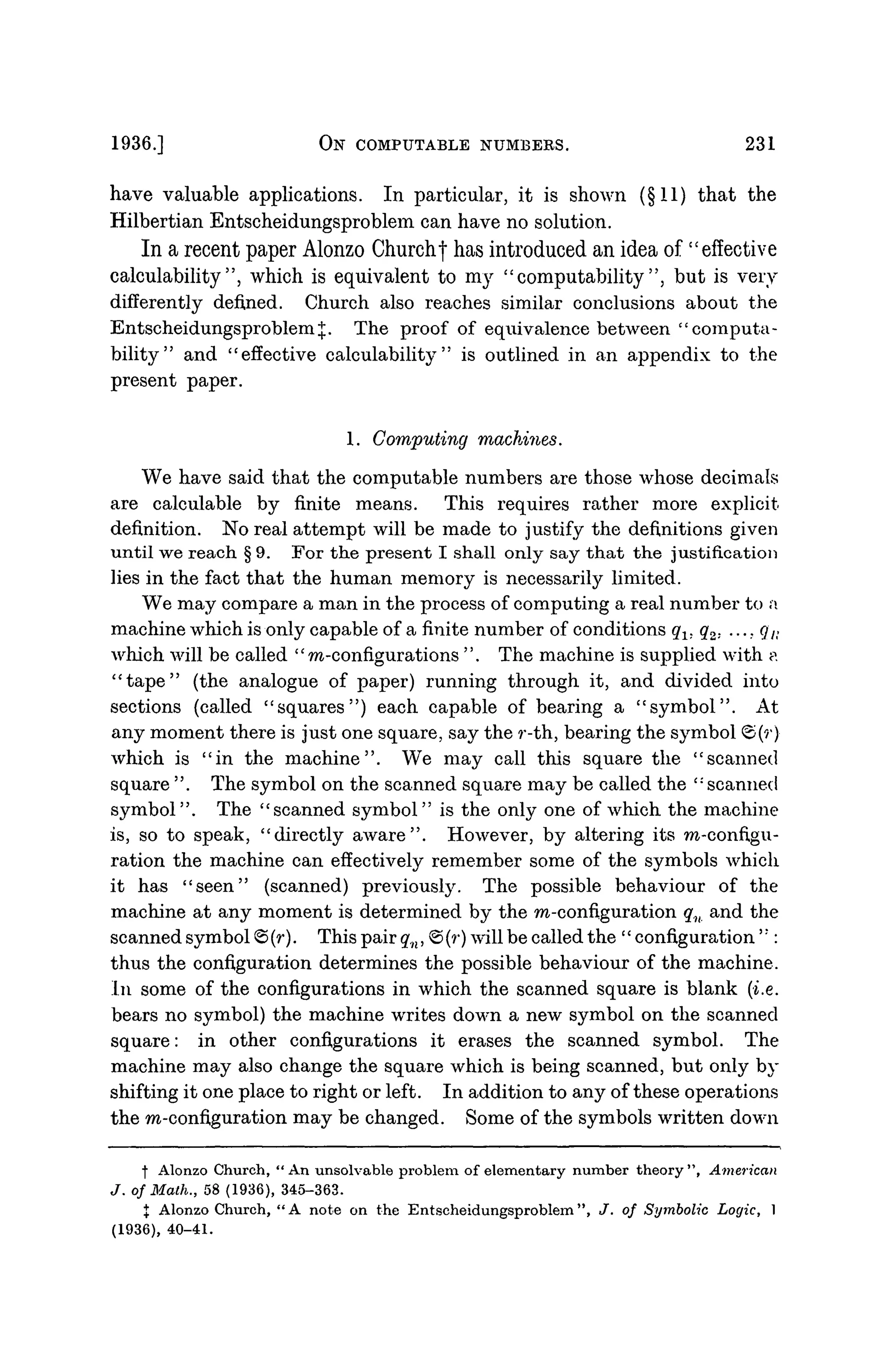 This document discusses computable numbers, defined as real numbers whose decimal representation can be computed by finite means, and introduces the theory of computing machines that can perform computations based on configurations and scanned symbols. It outlines the concepts of automatic and computing machines, explains the processes involved in computing sequences and numbers, and compares Turing's definitions with Alonzo Church's notion of effective calculability, demonstrating their equivalence. Furthermore, the document describes specific examples of machines and their configurations while proposing methods to simplify the presentation of machine operations.