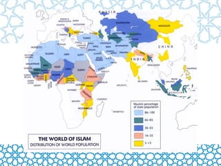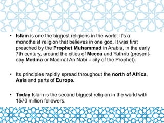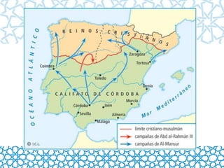 This document discusses the history of Islam and its arrival in the Iberian Peninsula, known as Al-Andalus. It began with the Umayyad conquest in 711 AD and the creation of an Islamic state. Muslims ruled Al-Andalus until 1492, leaving influences on Spanish culture, art, customs and language. The golden age was the Caliphate of Cordoba in the 10th century, though Al-Andalus eventually fractured and was reduced to the Nasrid Kingdom of Granada by the 13th century before the final Islamic rule ended in 1492.