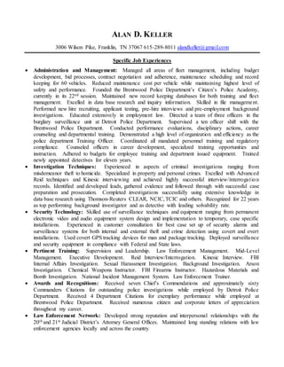 Alan D. Keller has over 30 years of experience in law enforcement, including positions as a detective sergeant, detective, patrol officer, and supervisor in both the Brentwood Police Department in Tennessee and the Detroit Police Department in Michigan. He has extensive experience in criminal investigations ranging from theft to homicide and is proficient in investigation techniques such as surveillance and interviewing. Keller also has experience in administration, management, and training of law enforcement personnel.