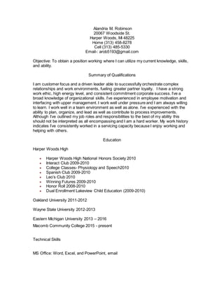 This resume is for Alandria M. Robinson. She is seeking a position where she can utilize her customer service, leadership, and organizational skills. She has experience in various retail and food service roles, including at Starbucks, Charlotte Russe, and Aerie. She is proficient in Microsoft Office and has a background in childcare. Her education includes an Associate's degree from Eastern Michigan University.