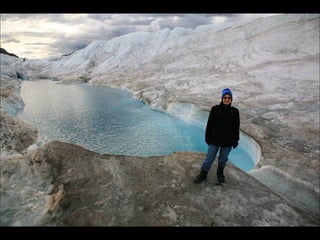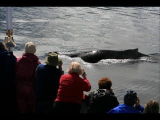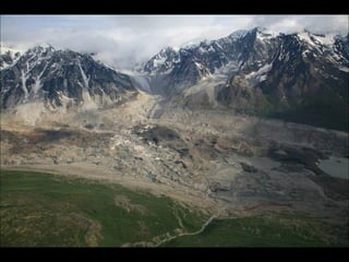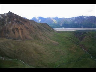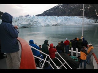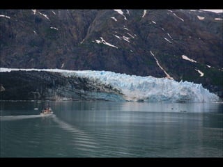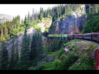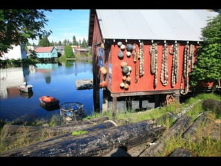 The document provides a photographic tour of various locations in Alaska, beginning in Fairbanks and covering Denali National Park, Juneau, Skagway, Sitka, Petersburg, Metlakatla, and Ketchikan. Key sights photographed include the Midnight Sun in Fairbanks, the Trans-Alaska Pipeline, glaciers in Denali National Park, Russian Orthodox churches in Sitka that show the influence of early Russian settlers, Native Alaskan cultural practices like totem pole carving and dances, and the natural beauty of coastal towns.