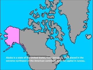 Alaska is a state located in the northwest of the United States with its capital in Juneau. Some key geographical features include the Aleutian Islands and Denali National Park. The climate varies by region from oceanic on the western coast to continental and arctic elsewhere. Some of the largest cities in Alaska are Anchorage, Juneau, Fairbanks, Sitka, Ketchikan, Kenai, Kodiak, Bethel, Wasilla, and Barrow.