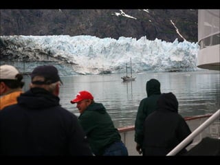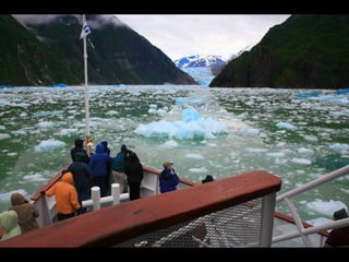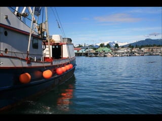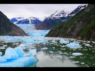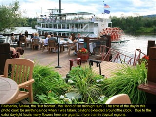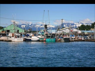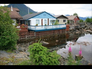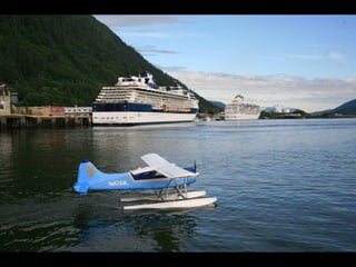 Alaska is known as the "last frontier" with long summer days and gigantic flowers. Typical homes in Fairbanks have heavy logs and multiple paned windows. Most travel is by small private aircraft or boats along rivers and pipelines carry oil above the frozen ground. Visitors can see Denali National Park by helicopter or luxury train and its blue glaciers formed under pressure over thousands of years. Southeast Alaska has many communities connected by water and ferries, with towns like Skagway and Sitka showcasing Native culture through totem poles and dance despite Russian Orthodox influence. Wildlife like eagles, whales, and salmon are prevalent in the rugged coastal landscape.