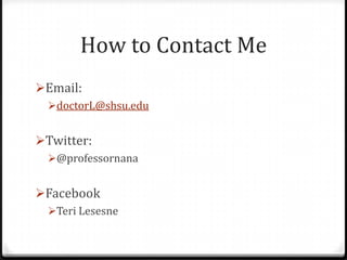This document provides contact information for "DoctorL" including their email, Twitter handle, and Facebook profile. It also lists several resources and topics for discussion including a back channel for questions, slideshare materials, book matching strategies, educational psychology theories, and recommended books. The document contains information about connecting with readers through various formats and levels.