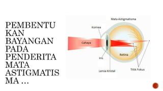 Dokumen ini membahas tentang alat optik dan bagian-bagian mata serta fungsinya dalam penglihatan. Selain itu, dijelaskan pula berbagai kelainan mata, jenis kacamata yang digunakan untuk mengoreksinya, serta cara kerja alat optik seperti kamera, mikroskop, dan teropong. Informasi mengenai kondisi seperti rabun jauh, rabun dekat, presbiopi, astigmatisma, katarak, dan glaukoma juga dijelaskan di dalamnya.