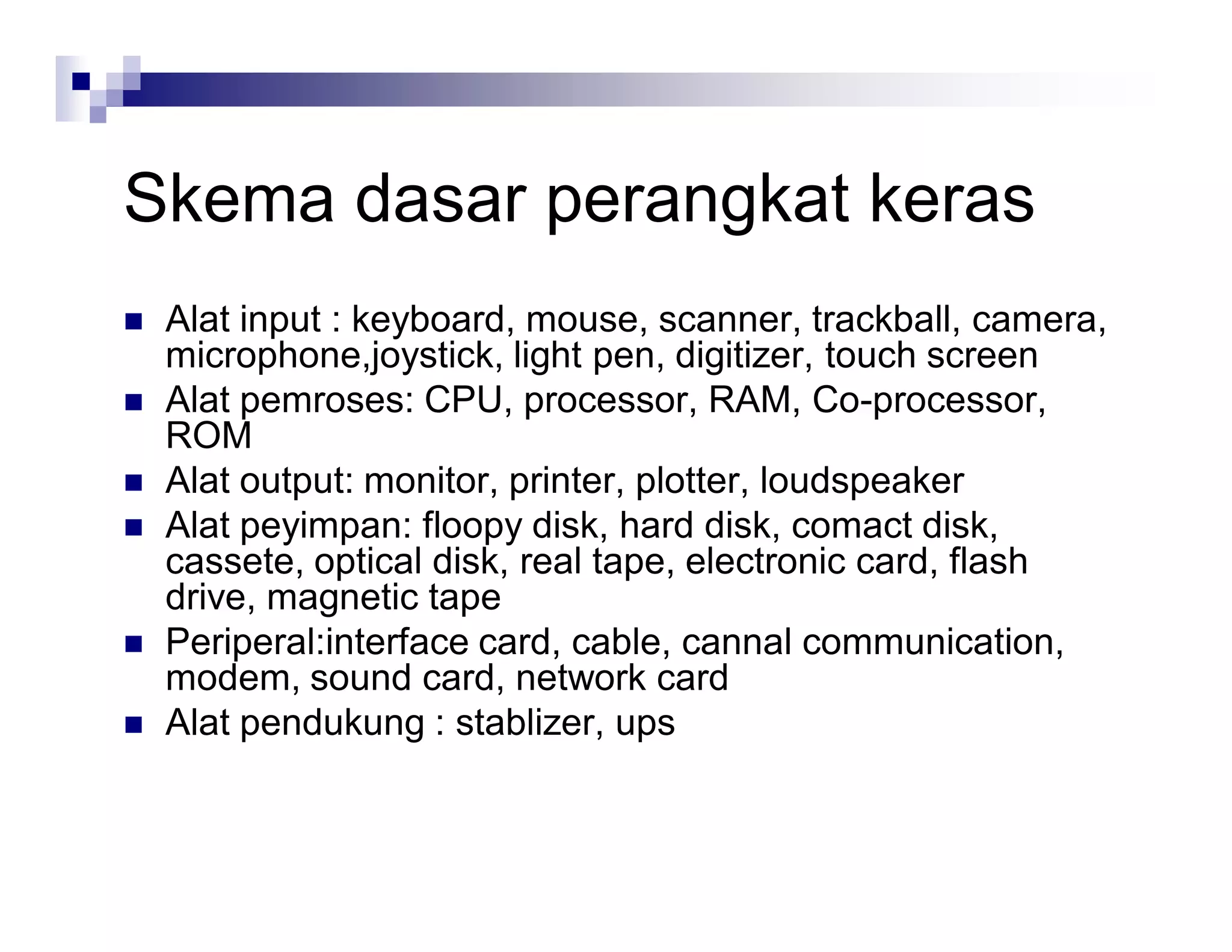 Dokumen tersebut membahas tentang alat input, pemrosesan data, dan output dalam sistem komputer. Secara singkat, dokumen menjelaskan berbagai jenis alat input seperti keyboard, mouse, scanner, kamera; alat pemroses seperti CPU dan memory; serta alat output seperti monitor dan printer. Dokumen juga menjelaskan fungsi dan cara kerja masing-masing alat tersebut dalam sistem komputer.