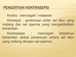 Dokumen tersebut membahas tentang berbagai metode kontrasepsi yang ada beserta gambarannya. Ada delapan metode kontrasepsi alami dan modern yang dijelaskan secara singkat mulai dari coitus interruptus, spermatisida, vagina diafragma, pil KB, suntik KB, implan/susuk KB, IUD, hingga sterilisasi. Tujuan akhir program KB adalah menurunkan tingkat fertilitas untuk mengurangi beban pembangunan dan demi kesejahteraan rakyat Indonesia