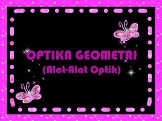 Dokumen tersebut membahas tentang alat-alat optik seperti mata, kamera, lup, dan mikroskop. Dijelaskan cara kerja, persamaan, dan komponen-komponen utama dari setiap alat optik tersebut.
