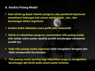 Dokumen ini membincangkan pelbagai alat perancangan seperti analisis pulang modal, carta Gantt, dan kaedah laluan genting (CPM) untuk mengurus projek dan sumber dalam organisasi. Ia menerangkan bagaimana analisis pulang modal membantu syarikat memahami kos dan keuntungan, penggunaan carta Gantt untuk merancang dan mengawal aktiviti, serta CPM untuk mengenal pasti aktiviti kritikal bagi memastikan projek disiapkan tepat pada masanya. Setiap alat memainkan peranan penting dalam meraih keuntungan dan mengurus masa serta sumber dengan berkesan.