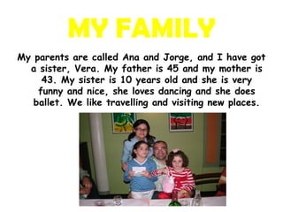 Alba is a 12-year-old girl who lives in Huesca and studies at S. Viator. She has parents named Ana and Jorge, a 10-year-old sister named Vera who loves dancing and does ballet. Alba enjoys dancing, ballet, spending time with friends, reading, learning languages like English and French. She likes Italian food like pizza and pasta as well as sushi. Her favorite animals are dogs and koalas, and her favorite color is blue. She also provides details about her friend Paula.