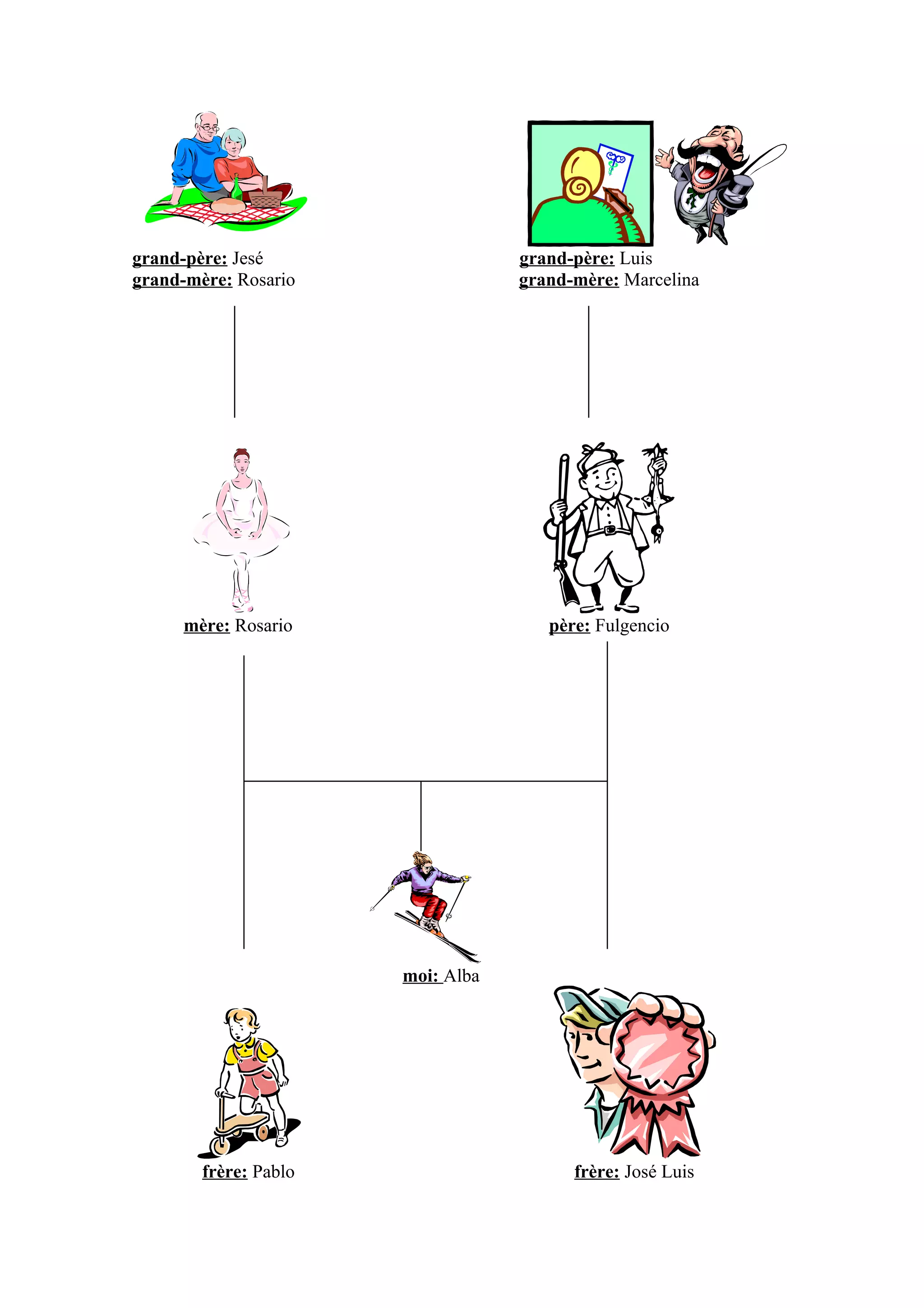This document presents a family tree showing Alba's grandparents on both sides of her family, her parents Rosario and Fulgencio, and her brothers Pablo and Jose Luis. It traces Alba's lineage back two generations on both her mother and father's side of the family.