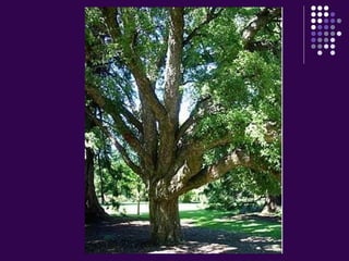 The document summarizes key details about the cork oak tree (Quercus suber alba Rodríguez). It notes that the tree is native to southwest Europe and northwest Africa, has rugged corky bark that can be harvested every 10-12 years, and lives 150-250 years. The evergreen leaves are dark green above and paler beneath, measuring 4-7 cm long. The tree produces acorns that are 2-3 cm long.