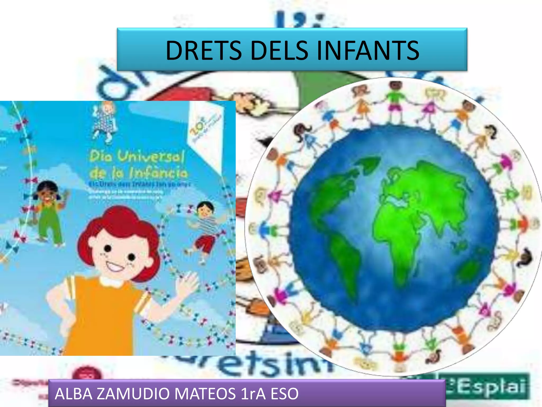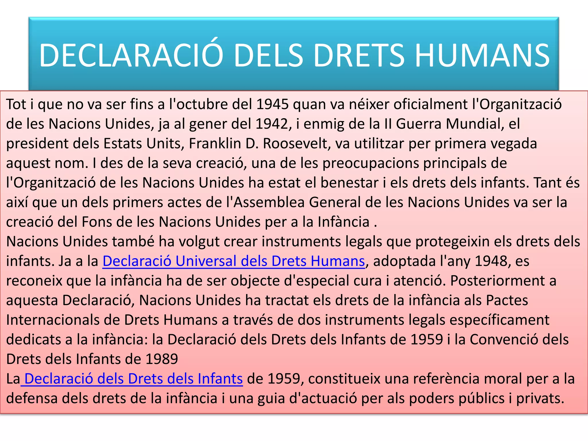 DECLARACIÓ DELS DRETSHUMANSTot i que no va ser fins a l'octubre del 1945 quan va néixer oficialment l'Organització de les Nacions Unides, ja al gener del 1942, i enmig de la II Guerra Mundial, el president dels Estats Units, Franklin D. Roosevelt, va utilitzar per primera vegada aquest nom. I des de la seva creació, una de les preocupacions principals de l'Organització de les Nacions Unides ha estat el benestar i els drets dels infants. Tant és així que un dels primers actes de l'Assemblea General de les Nacions Unides va ser la creació del Fons de les Nacions Unides per a la Infància .Nacions Unides també ha volgut crear instruments legals que protegeixin els drets dels infants. Ja a la Declaració Universal dels Drets Humans, adoptada l'any 1948, es reconeix que la infància ha de ser objecte d'especial cura i atenció. Posteriorment a aquesta Declaració, Nacions Unides ha tractat els drets de la infància als Pactes Internacionals de Drets Humans a través de dos instruments legals específicament dedicats a la infància: la Declaració dels Drets dels Infants de 1959 i la Convenció dels Drets dels Infants de 1989La Declaració dels Drets dels Infants de 1959, constitueix una referència moral per a la defensa dels drets de la infància i una guia d'actuació per als poders públics i privats.