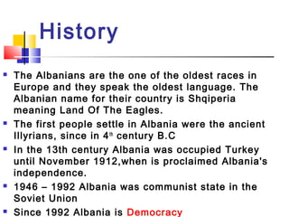 The document summarizes key facts about Albania. It states that Albania has a long history, with the earliest settlers being the ancient Illyrians in the 4th century BC. Albania was occupied by the Ottoman Empire until 1912 when it declared independence. From 1946 to 1992 it was a communist state within the Soviet Union. It has since become a democracy. The document provides demographic information, noting Tirana as the capital and the Albanian language as unique. It also highlights some famous Albanians and describes popular tourist destinations in northern, western, and southern Albania.