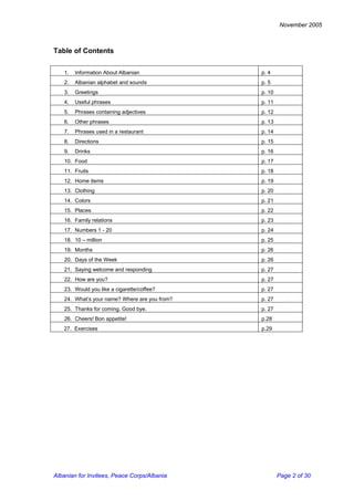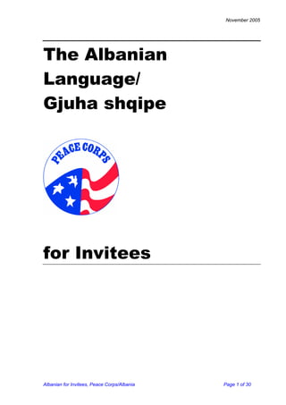 The document, intended for Peace Corps invitees, provides an overview of the Albanian language, including its alphabet, sounds, greetings, and useful phrases. It features lessons on phonetics, grammatical structure, and vocabulary across various contexts, such as dining and directions. Additionally, it includes audio tracks that accompany the lessons for better pronunciation and comprehension.