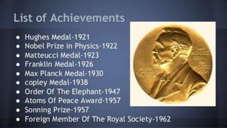 The document provides a detailed biography of Albert Einstein, highlighting key events in his life including his education, major scientific contributions like the theory of relativity and the Nobel Prize in Physics, as well as personal milestones such as his marriages and emigration to the U.S. It covers significant dates and achievements from his birth in 1879 to his death in 1955, along with the impact of his work on modern physics. Additionally, it discusses applications of his theories, such as gravitational waves, and concludes with notable quotes.